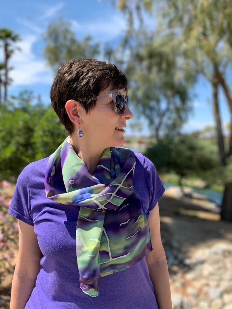 100% Crepe de Chine Silk. This is an 11”x60” hand dyed scarf of which there is only one as each scarf from Janell Silk Studio is a unique work of art. This scarf is a blend of plum, lemon chiffon, sage, and slate blue dyes.